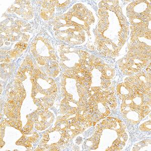 | IHC检测Calnexin蛋白(货号 GB151369). 样品: 人肺癌, 4%多聚甲醛 (货号G1101) 固定12-24小时. 抗原修复: Tris-EDTA抗原修复液(pH 9.0) (G1203), 100℃, 25分钟. —抗: 1: 500稀释, 4℃ 孵育过夜. 二抗: S-vision免疫组化多聚二抗(山羊抗小鼠), 即用型(货号G1301), 室温孵育20分钟. |