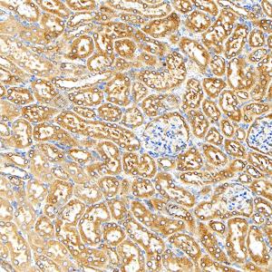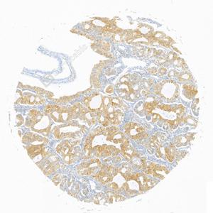 | IHC检测Calnexin蛋白(货号 GB151369). 样品: 大鼠肾, 4%多聚甲醛 (货号G1101) 固定12-24小时. 抗原修复: Tris-EDTA抗原修复液(pH 9.0) (G1203), 100℃, 25分钟. —抗: 1: 500稀释, 4℃ 孵育过夜. 二抗: S-vision免疫组化多聚二抗(山羊抗小鼠), 即用型(货号G1301), 室温孵育20分钟. |