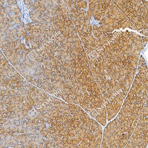 | IHC检测Calnexin蛋白(货号 GB151369). 样品: 人子宫内膜癌, 4%多聚甲醛 (货号G1101) 固定12-24小时. 抗原修复: Tris-EDTA抗原修复液(pH 9.0) (G1203), 100℃, 25分钟. —抗: 1: 500稀释, 4℃ 孵育过夜. 二抗: S-vision免疫组化多聚二抗(山羊抗小鼠), 即用型(货号G1301), 室温孵育20分钟. |