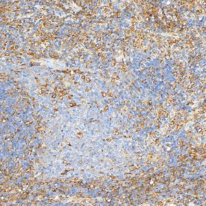 | IHC检测Calnexin蛋白(货号 GB151369). 样品: 人扁桃体, 4%多聚甲醛 (货号G1101) 固定12-24小时. 抗原修复: Tris-EDTA抗原修复液(pH 9.0) (G1203), 100℃, 25分钟. —抗: 1: 500稀释, 4℃ 孵育过夜. 二抗: S-vision免疫组化多聚二抗(山羊抗小鼠), 即用型(货号G1301), 室温孵育20分钟. |