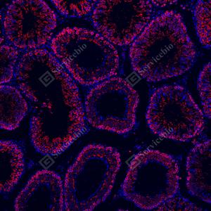 | IF检测Calnexin蛋白(货号 GB151369)(红色). 样品: 大鼠睾丸, 4%多聚甲醛 (货号G1101) 固定12-24小时. 抗原修复: Tris-EDTA抗原修复液(pH 9.0) (G1203), 100℃, 25分钟. 封闭: 3% BSA(货号GC305010)的PBS溶液, 室温孵育30分钟. —抗: 1: 500稀释, 4℃ 孵育过夜. 二抗: Cy3标记山羊抗小鼠IgG (H+L) (货号GB21301), 1: 300稀释, 室温孵育1小时. |
