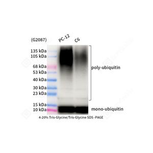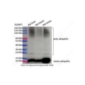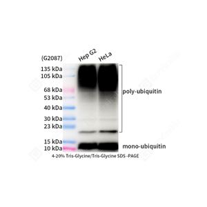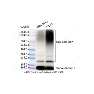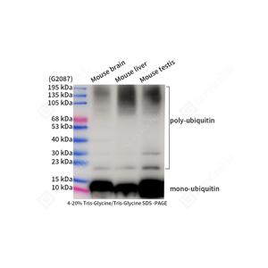 | WB检测Ubiquitin蛋白(货号 GB155700). 样品: 经RIPA裂解液(货号G2002)处理的蛋白质. 封闭: 3%脱脂牛奶(货号GC310001)溶于TBST溶液, 室温孵育1小时. —抗: 1: 1000稀释, 4℃ 孵育过夜. 二抗: HRP标记山羊抗兔IgG (H+L) (货号GB23303), 1: 5000稀释, 室温孵育1小时. |
