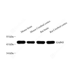 WB检测GAP43蛋白(货号 GB12095). 样品: 经RIPA裂解液(货号G2002)处理的蛋白质. 封闭: 3%脱脂牛奶(货号GC310001)溶于TBST溶液, 室温孵育1小时. —抗: 1: 2000稀释, 4℃ 孵育过夜. 二抗: HRP标记山羊抗小鼠IgG (H+L) (货号GB23301), 1: 5000稀释, 室温孵育1小时. |