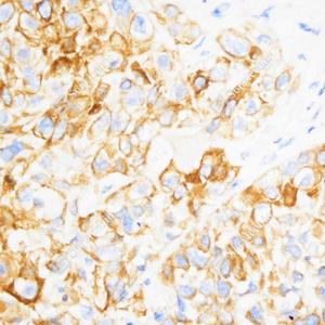 | IHC检测Cytokeratin 14蛋白(货号 GB15803). 样品: 人食管癌, 4%多聚甲醛 (货号G1101) 固定12-24小时. 抗原修复: 柠檬酸抗原修复液(干粉, pH 6.0) (G1201), 高压锅均匀喷气计时2分钟. —抗: 1: 1000稀释, 4℃ 孵育过夜. 二抗: HRP标记山羊抗小鼠IgG (H+L) (货号GB23301), 1: 200稀释, 室温孵育1小时. |