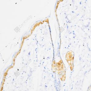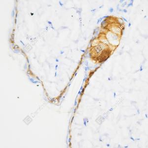 | IHC检测Cytokeratin 14蛋白(货号 GB15803). 样品: 小鼠皮肤, 4%多聚甲醛 (货号G1101) 固定12-24小时. 抗原修复: 柠檬酸抗原修复液(干粉, pH 6.0) (G1201), 高压锅均匀喷气计时2分钟. —抗: 1: 1000稀释, 4℃ 孵育过夜. 二抗: HRP标记山羊抗小鼠IgG (H+L) (货号GB23301), 1: 200稀释, 室温孵育1小时. |