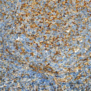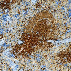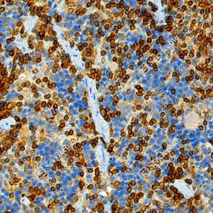 IHC检测TMEM173蛋白(货号 GB150063). 样品: 人扁桃体, 4%多聚甲醛 (货号G1101) 固定12-24小时. 抗原修复: 柠檬酸抗原修复液 (干粉, pH 6.0) (G1201), 高压锅均匀喷气计时2分钟. —抗: 1: 1000稀释, 4℃ 孵育过夜. 二抗: S-vision免疫组化多聚二抗(山羊抗兔),即用型 (货号G1302), 室温孵育20分钟. |