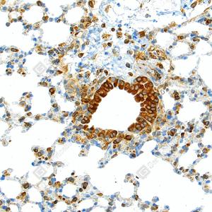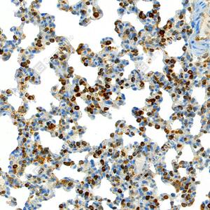 IHC检测TMEM173蛋白(货号 GB150063). 样品: 小鼠肺损伤, 4%多聚甲醛 (货号G1101) 固定12-24小时. 抗原修复: 柠檬酸抗原修复液 (干粉, pH 6.0) (G1201), 高压锅均匀喷气计时2分钟. —抗: 1: 1000稀释, 4℃ 孵育过夜. 二抗: S-vision免疫组化多聚二抗(山羊抗兔),即用型 (货号G1302), 室温孵育20分钟. |