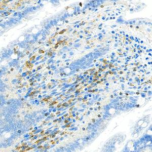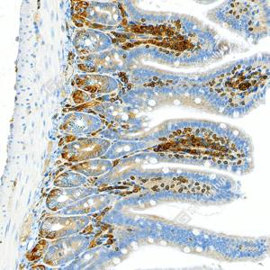 IHC检测TMEM173蛋白(货号 GB150063). 样品: 小鼠小肠, 4%多聚甲醛 (货号G1101) 固定12-24小时. 抗原修复: 柠檬酸抗原修复液 (干粉, pH 6.0) (G1201), 高压锅均匀喷气计时2分钟. —抗: 1: 1000稀释, 4℃ 孵育过夜. 二抗: S-vision免疫组化多聚二抗(山羊抗兔),即用型 (货号G1302), 室温孵育20分钟. |