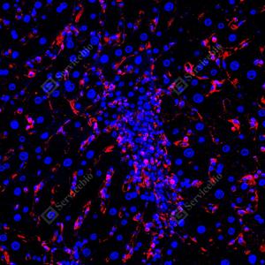 IF检测TMEM173蛋白(货号 GB150063)(红色). 样品: 大鼠肝, 4%多聚甲醛 (货号G1101) 固定12-24小时. 抗原修复: 柠檬酸抗原修复液 (干粉, pH 6.0) (G1201), 高压锅均匀喷气计时2分钟. —抗: 1: 1000稀释, 4℃ 孵育过夜. 二抗: Cy3标记山羊抗兔IgG (H+L) (货号GB21303), 1: 300稀释, 室温孵育1小时. |