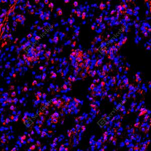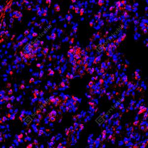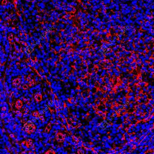 IF检测TMEM173蛋白(货号 GB150063)(红色). 样品: 人扁桃体, 4%多聚甲醛 (货号G1101) 固定12-24小时. 抗原修复: 柠檬酸抗原修复液 (干粉, pH 6.0) (G1201), 高压锅均匀喷气计时2分钟. —抗: 1: 1000稀释, 4℃ 孵育过夜. 二抗: Cy3标记山羊抗兔IgG (H+L) (货号GB21303), 1: 300稀释, 室温孵育1小时. |