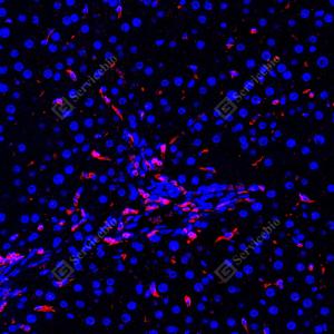 IF检测TMEM173蛋白(货号 GB150063)(红色). 样品: 人肝, 4%多聚甲醛 (货号G1101) 固定12-24小时. 抗原修复: 柠檬酸抗原修复液 (干粉, pH 6.0) (G1201), 高压锅均匀喷气计时2分钟. —抗: 1: 1000稀释, 4℃ 孵育过夜. 二抗: Cy3标记山羊抗兔IgG (H+L) (货号GB21303), 1: 300稀释, 室温孵育1小时. |