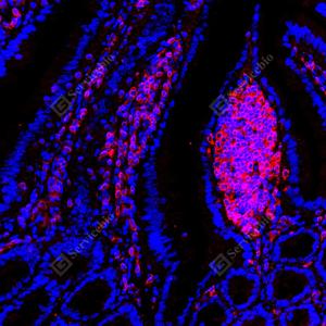 IF检测TMEM173蛋白(货号 GB150063)(红色). 样品: 大鼠小肠, 4%多聚甲醛 (货号G1101) 固定12-24小时. 抗原修复: 柠檬酸抗原修复液 (干粉, pH 6.0) (G1201), 高压锅均匀喷气计时2分钟. —抗: 1: 1000稀释, 4℃ 孵育过夜. 二抗: Cy3标记山羊抗兔IgG (H+L) (货号GB21303), 1: 300稀释, 室温孵育1小时. |