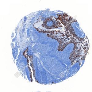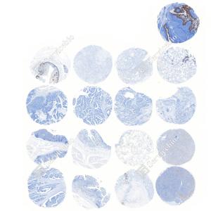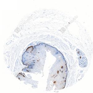 | IHC检测Cytokeratin 14蛋白(货号 GB150146). 样品: 人TMA, 4%多聚甲醛 (货号G1101) 固定12-24小时. 抗原修复: 抗原修复仪 (货号 ARI-4),Tris-EDTA抗原修复液(pH 9.0) (货号G1203), 水浴100℃, 25分钟. —抗: 1: 1000稀释, 4℃ 孵育过夜. 二抗: S-vision免疫组化多聚二抗(山羊抗兔),即用型 (货号G1302), 室温孵育20分钟. |
