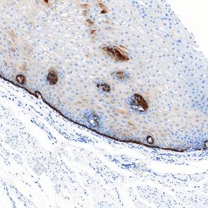 | IHC检测Cytokeratin 14蛋白(货号 GB150146). 样品: 小鼠食管, 4%多聚甲醛 (货号G1101) 固定12-24小时. 抗原修复: 抗原修复仪 (货号 ARI-4),Tris-EDTA抗原修复液(pH 9.0) (货号G1203), 水浴100℃, 25分钟. —抗: 1: 500稀释, 4℃ 孵育过夜. 二抗: S-vision免疫组化多聚二抗(山羊抗兔),即用型 (货号G1302), 室温孵育20分钟. |