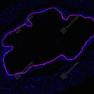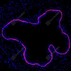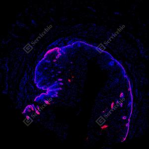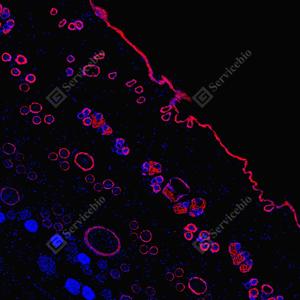 | IF检测Cytokeratin 14蛋白(货号 GB150146)(红色). 样品: 小鼠食管, 4%多聚甲醛 (货号G1101) 固定12-24小时. 抗原修复: 抗原修复仪 (货号 ARI-4),Tris-EDTA抗原修复液(pH 9.0) (货号G1203), 水浴100℃, 25分钟. 封闭: 3% BSA(货号GC305010)的PBS溶液, 室温孵育30分钟. —抗: 1: 500稀释, 4℃ 孵育过夜. 二抗: Cy3标记山羊抗兔IgG (H+L) (货号GB21303), 1: 300稀释, 室温孵育1小时. |