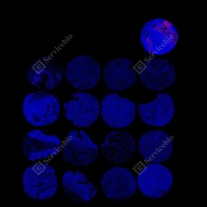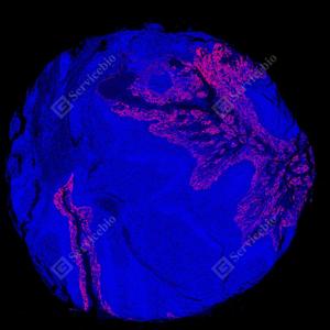 | IF检测Cytokeratin 14蛋白(货号 GB150146)(红色). 样品: 人TMA, 4%多聚甲醛 (货号G1101) 固定12-24小时. 抗原修复: 抗原修复仪 (货号 ARI-4),Tris-EDTA抗原修复液(pH 9.0) (货号G1203), 水浴100℃, 25分钟. 封闭: 3% BSA(货号GC305010)的PBS溶液, 室温孵育30分钟. —抗: 1: 500稀释, 4℃ 孵育过夜. 二抗: Cy3标记山羊抗兔IgG (H+L) (货号GB21303), 1: 300稀释, 室温孵育1小时. |