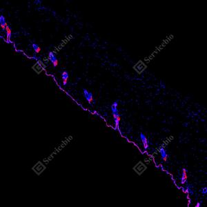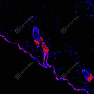 | IF检测Cytokeratin 14蛋白(货号 GB150146)(红色). 样品: 小鼠皮肤, 4%多聚甲醛 (货号G1101) 固定12-24小时. 抗原修复: 抗原修复仪 (货号 ARI-4),Tris-EDTA抗原修复液(pH 9.0) (货号G1203), 水浴100℃, 25分钟. 封闭: 3% BSA(货号GC305010)的PBS溶液, 室温孵育30分钟. —抗: 1: 500稀释, 4℃ 孵育过夜. 二抗: Cy3标记山羊抗兔IgG (H+L) (货号GB21303), 1: 300稀释, 室温孵育1小时. |