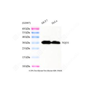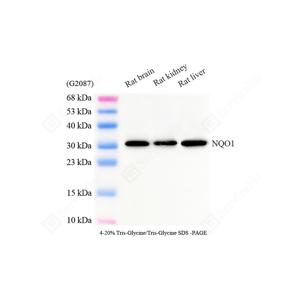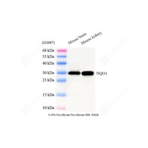 | WB检测NQO1蛋白(货号 GB15282). 样品: 经RIPA裂解液(货号G2002)处理的蛋白质. 封闭: 3%脱脂牛奶(货号GC310001)溶于TBST溶液, 室温孵育1小时. —抗: 1: 1500稀释, 4℃ 孵育过夜. 二抗: HRP标记山羊抗兔IgG (H+L) (货号GB23303), 1: 5000稀释, 室温孵育1小时. |