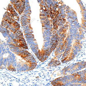 | IHC检测NQO1蛋白(货号 GB15282). 样品: 人结肠癌, 4%多聚甲醛 (货号G1101) 固定12-24小时. 抗原修复: Tris-EDTA抗原修复液(pH 9.0) (G1203), 100℃, 25分钟. —抗: 1: 1000稀释, 4℃ 孵育过夜. 二抗: S-vision免疫组化多聚二抗(山羊抗兔),即用型 (货号G1302), 室温孵育20分钟. |