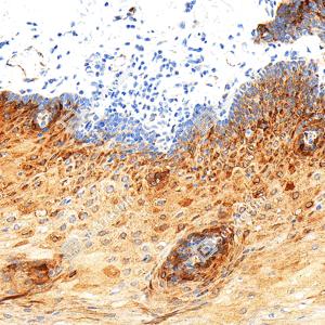 | IHC检测NQO1蛋白(货号 GB15282). 样品: 人食管, 4%多聚甲醛 (货号G1101) 固定12-24小时. 抗原修复: Tris-EDTA抗原修复液(pH 9.0) (G1203), 100℃, 25分钟. —抗: 1: 1000稀释, 4℃ 孵育过夜. 二抗: S-vision免疫组化多聚二抗(山羊抗兔),即用型 (货号G1302), 室温孵育20分钟. |