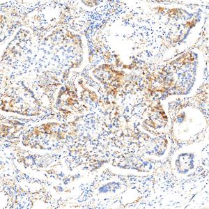 | IHC检测NQO1蛋白(货号 GB15282). 样品: 人肺癌, 4%多聚甲醛 (货号G1101) 固定12-24小时. 抗原修复: Tris-EDTA抗原修复液(pH 9.0) (G1203), 100℃, 25分钟. —抗: 1: 1000稀释, 4℃ 孵育过夜. 二抗: S-vision免疫组化多聚二抗(山羊抗兔),即用型 (货号G1302), 室温孵育20分钟. |