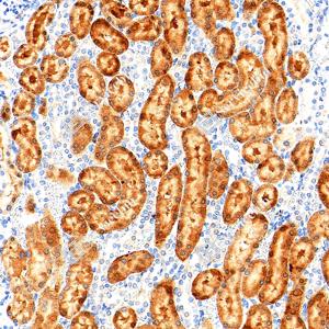 | IHC检测NQO1蛋白(货号 GB15282). 样品: 大鼠肾, 4%多聚甲醛 (货号G1101) 固定12-24小时. 抗原修复: Tris-EDTA抗原修复液(pH 9.0) (G1203), 100℃, 25分钟. —抗: 1: 1000稀释, 4℃ 孵育过夜. 二抗: S-vision免疫组化多聚二抗(山羊抗兔),即用型 (货号G1302), 室温孵育20分钟. |