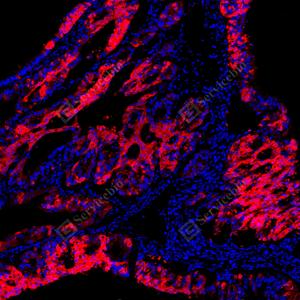 | IF检测NQO1蛋白(货号 GB15282)(红色). 样品: 人结肠癌, 4%多聚甲醛 (货号G1101) 固定12-24小时. 抗原修复: Tris-EDTA抗原修复液(pH 9.0) (G1203), 100℃, 25分钟. 封闭: 3% BSA(货号GC305010)的PBS溶液, 室温孵育30分钟. —抗: 1: 1000稀释, 4℃ 孵育过夜. 二抗: Cy3标记山羊抗兔IgG (H+L) (货号GB21303), 1: 300稀释, 室温孵育1小时. |