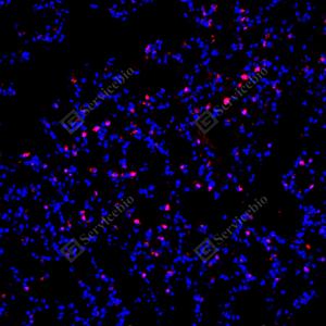 | IF检测NQO1蛋白(货号 GB15282)(红色). 样品: 大鼠肺, 4%多聚甲醛 (货号G1101) 固定12-24小时. 抗原修复: Tris-EDTA抗原修复液(pH 9.0) (G1203), 100℃, 25分钟. 封闭: 3% BSA(货号GC305010)的PBS溶液, 室温孵育30分钟. —抗: 1: 500稀释, 4℃ 孵育过夜. 二抗: Cy3标记山羊抗兔IgG (H+L) (货号GB21303), 1: 300稀释, 室温孵育1小时. |