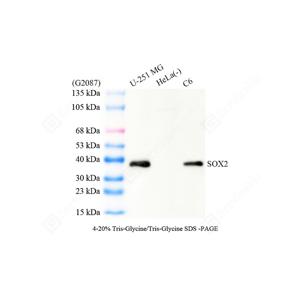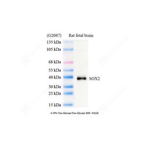 WB检测SOX2蛋白(货号 GB15249). 样品: 经RIPA裂解液(货号G2002)处理的蛋白质. 封闭: 3%脱脂牛奶(货号GC310001)溶于TBST溶液, 室温孵育1小时. —抗: 1: 500稀释, 4℃ 孵育过夜. 二抗: HRP标记山羊抗兔IgG (H+L) (货号GB23303), 1: 5000稀释, 室温孵育1小时. |