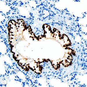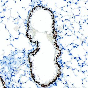 IHC检测 SOX2蛋白(货号 GB15249). 样品: 大鼠肺, 4%多聚甲醛 (货号G1101) 固定12-24小时. 抗原修复: 柠檬酸抗原修复液 (干粉, pH 6.0) (G1201), 高压锅均匀喷气计时2分钟. —抗: 1: 1000稀释, 4℃ 孵育过夜. 二抗: S-vision免疫组化多聚二抗(山羊抗兔),即用型 (货号G1302), 室温孵育20分钟. |