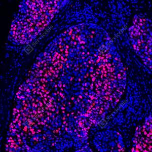 IF检测 SOX2蛋白(货号 GB15249)(红色). 样品: 人食管癌, 4%多聚甲醛 (货号G1101) 固定12-24小时. 抗原修复: 柠檬酸抗原修复液 (干粉, pH 6.0) (G1201), 高压锅均匀喷气计时2分钟. —抗: 1: 1000稀释, 4℃ 孵育过夜. 二抗: Cy3标记山羊抗兔IgG (H+L) (货号GB21303), 1: 300稀释, 室温孵育1小时. |