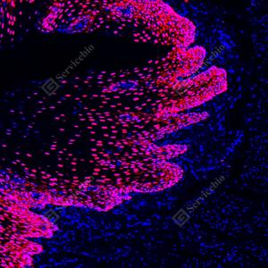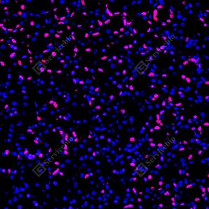 IF检测SOX2蛋白(货号 GB15249)(红色). 样品: 小鼠肺, 4%多聚甲醛 (货号G1101) 固定12-24小时. 抗原修复: 柠檬酸抗原修复液 (干粉, pH 6.0) (G1201), 高压锅均匀喷气计时2分钟. —抗: 1: 1000稀释, 4℃ 孵育过夜. 二抗: Cy3标记山羊抗兔IgG (H+L) (货号GB21303), 1: 300稀释, 室温孵育1小时. |