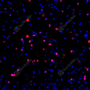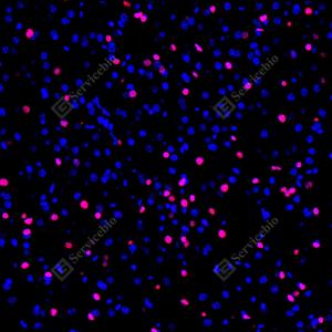 IF检测SOX2蛋白(货号 GB15249)(红色). 样品: 大鼠脑, 4%多聚甲醛 (货号G1101) 固定12-24小时. 抗原修复: 柠檬酸抗原修复液 (干粉, pH 6.0) (G1201), 高压锅均匀喷气计时2分钟. —抗: 1: 1000稀释, 4℃ 孵育过夜. 二抗: Cy3标记山羊抗兔IgG (H+L) (货号GB21303), 1: 300稀释, 室温孵育1小时. |
