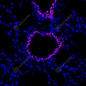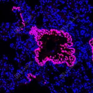 IF检测SOX2蛋白(货号 GB15249)(红色). 样品: 大鼠肺, 4%多聚甲醛 (货号G1101) 固定12-24小时. 抗原修复: 柠檬酸抗原修复液 (干粉, pH 6.0) (G1201), 高压锅均匀喷气计时2分钟. —抗: 1: 1000稀释, 4℃ 孵育过夜. 二抗: Cy3标记山羊抗兔IgG (H+L) (货号GB21303), 1: 300稀释, 室温孵育1小时. |