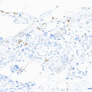 | IHC检测c-kit蛋白(货号 GB153799). 样品: 人乳腺癌, 4%多聚甲醛 (货号G1101) 固定12-24小时. 抗原修复: Tris-EDTA抗原修复液(pH 9.0) (G1203), 100℃, 25分钟. —抗: 1: 750稀释, 4℃ 孵育过夜. 二抗: S-vision免疫组化多聚二抗(山羊抗兔),即用型 (货号G1302), 室温孵育20分钟. |