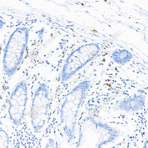 | IHC检测c-kit蛋白(货号 GB153799). 样品: 人结肠, 4%多聚甲醛 (货号G1101) 固定12-24小时. 抗原修复: Tris-EDTA抗原修复液(pH 9.0) (G1203), 100℃, 25分钟. —抗: 1: 300稀释, 4℃ 孵育过夜. 二抗: S-vision免疫组化多聚二抗(山羊抗兔),即用型 (货号G1302), 室温孵育20分钟. |
