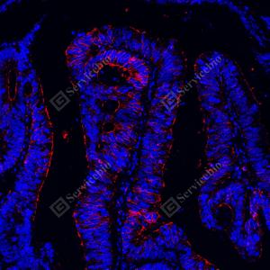 | IF检测c-kit蛋白(货号 GB153799)(红色). 样品: 人结肠癌, 4%多聚甲醛 (货号G1101) 固定12-24小时. 抗原修复: Tris-EDTA抗原修复液(pH 9.0) (G1203), 100℃, 25分钟. 封闭: 3% BSA(货号GC305010)的PBS溶液, 室温孵育30分钟. —抗: 1: 300稀释, 4℃ 孵育过夜. 二抗: Cy3标记山羊抗兔IgG (H+L) (货号GB21303), 1: 300稀释, 室温孵育1小时. |