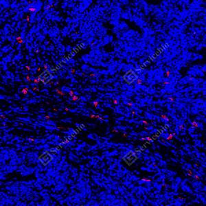 | IF检测c-kit蛋白(货号 GB153799)(红色). 样品: 人扁桃体, 4%多聚甲醛 (货号G1101) 固定12-24小时. 抗原修复: Tris-EDTA抗原修复液(pH 9.0) (G1203), 100℃, 25分钟. 封闭: 3% BSA(货号GC305010)的PBS溶液, 室温孵育30分钟. —抗: 1: 300稀释, 4℃ 孵育过夜. 二抗: Cy3标记山羊抗兔IgG (H+L) (货号GB21303), 1: 300稀释, 室温孵育1小时. |