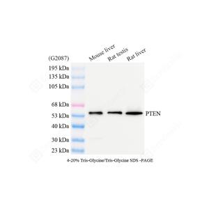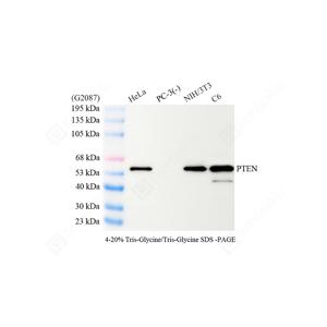 WB检测PTEN蛋白(货号 GB15169). 样品: 经RIPA裂解液(货号G2002)处理的蛋白质. 封闭: 3%脱脂牛奶(货号GC310001)溶于TBST溶液, 室温孵育1小时. —抗: 1: 1000稀释, 4℃ 孵育过夜. 二抗: HRP标记山羊抗兔IgG (H+L) (货号GB23303), 1: 5000稀释, 室温孵育1小时. |