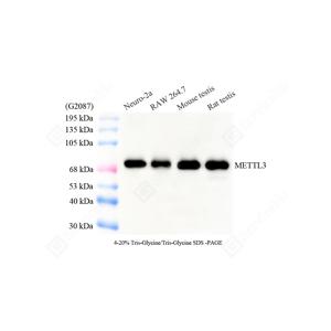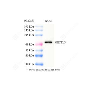 METTL3 is a key S-adenosyl-L-methionine-binding subunit, which is component of a complex multicomponent enzyme that catalyzes the methylation of internal adenosine residues in eukaryotic mRNA, forming N6-methyladenosine. It contains 2 putative nuclear localization signals and 2 consensus methylation motifs. The calculated molecular weight of METTL3 is 64 kDa, but modified METTL3 is about 65-70 kDa.