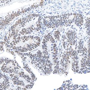 | IHC检测METTL3蛋白(货号 GB154688). 样品: 人结肠癌, 4%多聚甲醛 (货号G1101) 固定12-24小时. 抗原修复: Tris-EDTA抗原修复液(pH 9.0) (G1203), 100℃, 25分钟. —抗: 1: 500稀释, 4℃ 孵育过夜. 二抗: S-vision免疫组化多聚二抗(山羊抗兔),即用型 (货号G1302), 室温孵育20分钟. |