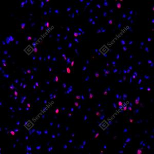 | IF检测METTL3蛋白(货号 GB154688)(红色). 样品: 小鼠脑, 4%多聚甲醛 (货号G1101) 固定12-24小时. 抗原修复: Tris-EDTA抗原修复液(pH 9.0) (G1203), 100℃, 25分钟. 封闭: 3% BSA(货号GC305010)的PBS溶液, 室温孵育30分钟. —抗: 1: 1500稀释, 4℃ 孵育过夜. 二抗: Cy3标记山羊抗兔IgG (H+L) (货号GB21303), 1: 300稀释, 室温孵育1小时. |