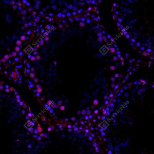 | IF检测METTL3蛋白(货号 GB154688)(红色). 样品: 大鼠睾丸, 4%多聚甲醛 (货号G1101) 固定12-24小时. 抗原修复: Tris-EDTA抗原修复液(pH 9.0) (G1203), 100℃, 25分钟. 封闭: 3% BSA(货号GC305010)的PBS溶液, 室温孵育30分钟. —抗: 1: 1500稀释, 4℃ 孵育过夜. 二抗: Cy3标记山羊抗兔IgG (H+L) (货号GB21303), 1: 300稀释, 室温孵育1小时. |