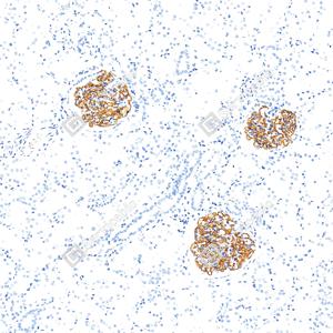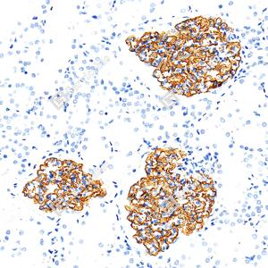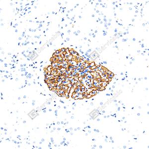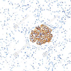 | IHC检测Nephrin蛋白(货号 GB155714). 样品: 人肾, 4%多聚甲醛 (货号G1101) 固定12-24小时. 抗原修复: Tris-EDTA抗原修复液(pH 9.0) (G1203), 100℃, 25分钟. —抗: 1: 200稀释, 4℃ 孵育过夜. 二抗: S-vision免疫组化多聚二抗(山羊抗兔),即用型 (货号G1302), 室温孵育20分钟. |