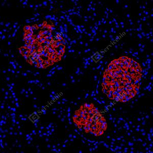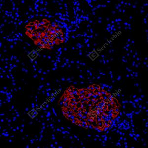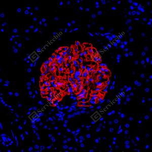 | IF检测Nephrin蛋白(货号 GB155714)(红色). 样品: 人肾, 4%多聚甲醛 (货号G1101) 固定12-24小时. 抗原修复: Tris-EDTA抗原修复液(pH 9.0) (G1203), 100℃, 25分钟. 封闭: 3% BSA(货号GC305010)的PBS溶液, 室温孵育30分钟. —抗: 1: 200稀释, 4℃ 孵育过夜. 二抗: Cy3标记山羊抗兔IgG (H+L) (货号GB21303), 1: 300稀释, 室温孵育1小时. |