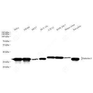 WB检测Galectin 3蛋白(货号 GB15246). 样品: 经RIPA裂解液(货号G2002)处理的蛋白质. 封闭: 3%脱脂牛奶(货号GC310001)溶于TBST溶液, 室温孵育1小时. —抗: 1: 500稀释, 4℃ 孵育过夜. 二抗: HRP标记山羊抗小鼠IgG (H+L) (货号GB23301), 1: 5000稀释, 室温孵育1小时. |