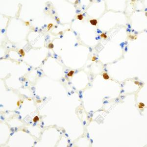 IHC检测Galectin 3蛋白(货号 GB15246). 样品: 小鼠肺, 4%多聚甲醛 (货号G1101) 固定12-24小时. 抗原修复: 柠檬酸抗原修复液(干粉, pH 6.0) (G1201), 高压锅均匀喷气计时2分钟. —抗: 1: 1000稀释, 4℃ 孵育过夜. 二抗: HRP标记山羊抗小鼠IgG (H+L) (货号GB23301), 1: 200稀释, 室温孵育1小时. |