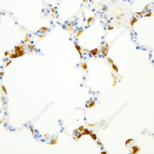 IHC检测Galectin 3蛋白(货号 GB15246). 样品: 大鼠肺, 4%多聚甲醛 (货号G1101) 固定12-24小时. 抗原修复: 柠檬酸抗原修复液(干粉, pH 6.0) (G1201), 高压锅均匀喷气计时2分钟. —抗: 1: 1000稀释, 4℃ 孵育过夜. 二抗: HRP标记山羊抗小鼠IgG (H+L) (货号GB23301), 1: 200稀释, 室温孵育1小时. |