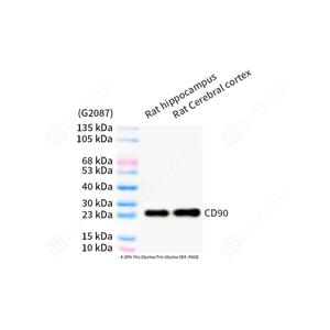 | WB检测CD90/Thy1蛋白(货号 GB153753). 样品: 经RIPA裂解液(货号G2002)处理的蛋白质. 封闭: 3%脱脂牛奶(货号GC310001)溶于TBST溶液, 室温孵育1小时. —抗: 1: 500稀释, 4℃ 孵育过夜. 二抗: HRP标记山羊抗兔IgG (H+L) (货号GB23303), 1: 5000稀释, 室温孵育1小时. |