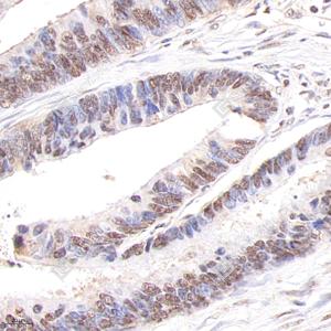 IHC检测FOXO1蛋白(货号 GB114935). 样品: 人结肠癌, 4%多聚甲醛 (货号G1101) 固定12-24小时. 抗原修复: 柠檬酸抗原修复液(干粉, pH 6.0) (G1201), 98℃, 20分钟. —抗: 1: 700稀释, 4℃ 孵育过夜. 二抗: HRP标记山羊抗兔IgG (H+L) (货号GB23303), 1: 200稀释, 室温孵育1小时. |